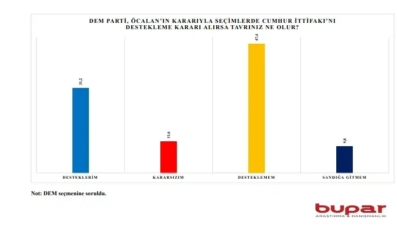 Araştırmaya göre, DEM Parti seçmeninin ezici çoğunluğu, terör örgütü PKK lideri Abdullah Öcalan’ın çağrısıyla bile Cumhur İttifakı’nı desteklemeyeceğini ifade etti.