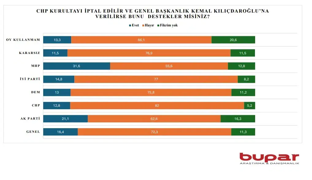 Araştırmada, “CHP kurultayı iptal edilir ve genel başkanlık Kemal Kılıçdaroğlu’na verilirse bunu destekler misiniz?” sorusuna verilen yanıtta da katılımcıların yüzde 65’ten fazlasının olumsuz karşılık verdiği görüldü.