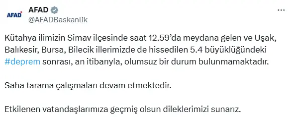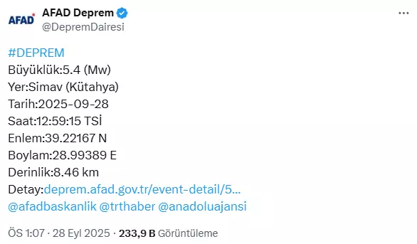 AFAD’ın verilerine göre, merkez üssü Simav ilçesi olan 5.4 büyüklüğünde bir deprem meydana geldi.