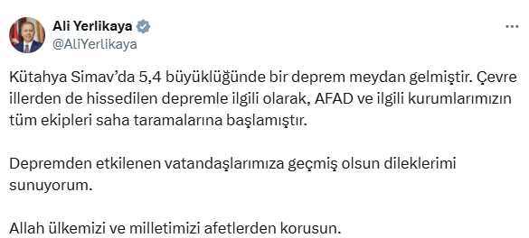 İçişleri Bakanı Ali Yerlikaya, depremin ardından AFAD ve diğer kurumların saha taramalarına başladığını duyurarak, vatandaşlara geçmiş olsun dileklerini iletti.